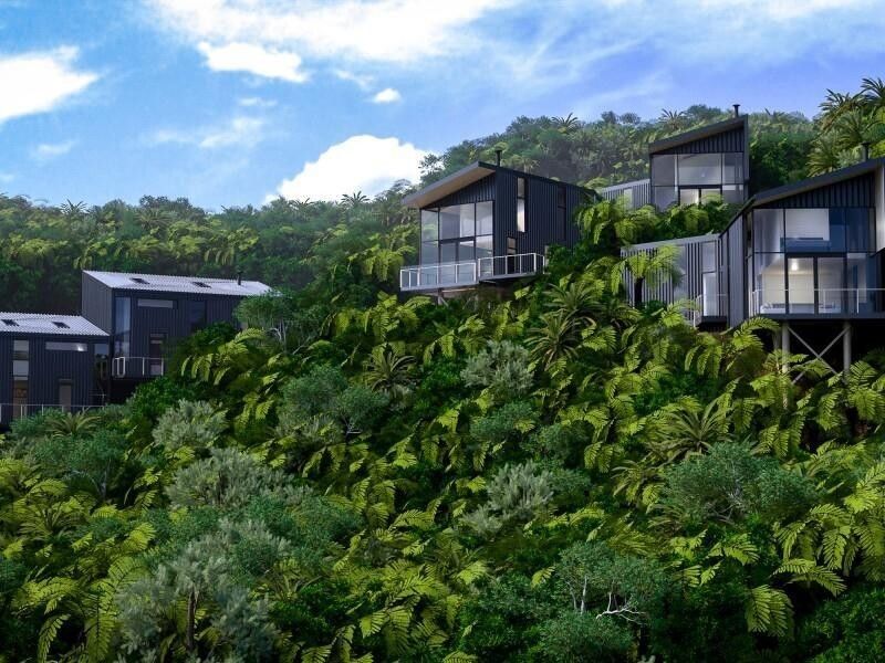 A subdivision on the western hills of Lower Hutt. The series of five houses sits on a steep slope clad in native bush. Designed by Foster and Melville Architects and affectionately named Treehouses.